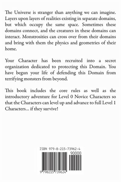 The Universe is stranger than anything we can imagine. Layers upon layers of realities existing in separate domains, but which occupy the same space. Sometimes these domains connect, and the creatures in these domains can interact. Monstrosities can cross over from their domains and bring with them the physics and geometries of their home. Your Character has been recruited into a secret organization dedicated to protecting this Domain. You have begun your life of defending this Domain from terrifying monsters from beyond. This book includes the core rules as well as the introductory adventure for Level 0 Novice Characters so that the Characters can level up and advance to full Level 1 Characters… if they survive!