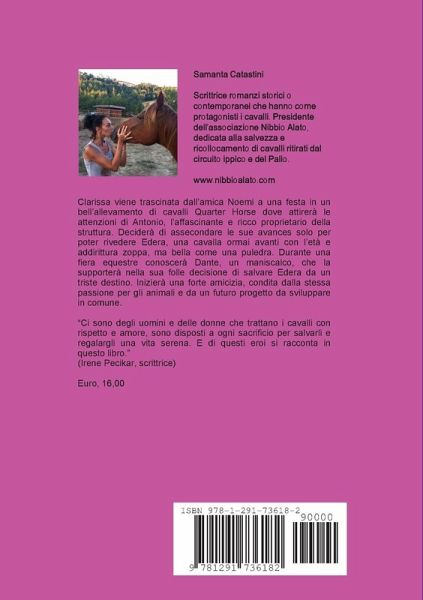 Clarissa viene trascinata dall'amica Noemi a una festa in un bell'allevamento di cavalli Quarter Horse dove attirerà le attenzioni di Antonio, l'affascinante e ricco proprietario della struttura. Deciderà di assecondare le sue avances solo per poter rivedere Edera, una cavalla ormai avanti con l'età e addirittura zoppa, ma bella come una puledra. Durante una fiera equestre conoscerà Dante, un maniscalco, che la supporterà nella sua folle decisione di salvare Edera da un triste destino. Inizierà una forte amicizia, condita dalla stessa passione per gli animali e da un futuro progetto da sviluppare in comune. "Ci sono degli uomini e delle donne che trattano i cavalli con rispetto e amore, sono disposti a ogni sacrificio per salvarli e regalargli una vita serena. E di questi eroi si racconta in questo libro." (Irene Pecikar, scrittrice)
