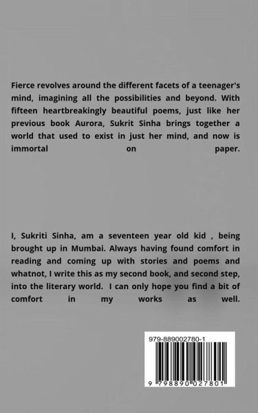 A collection of painstakingly beautiful poetries that remain closer to the author's heart. Be it heartbreak, the loss of a dear one, growing up in an abusive household, friendships, finding oneself, or even falling in love, Fierce covers it all. This anthology of 15 poems, a sequel to Aurora - Sukriti's first book, is sure to hold a special place in your heart as well.