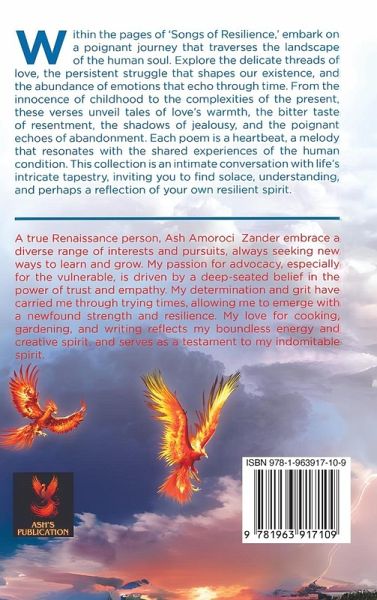 Within the pages of 'Songs of Resilience,' embark on a poignant journey that traverses the landscape of the human soul. Explore the delicate threads of love, the persistent struggle that shapes our existence, and the abundance of emotions that echo through time. From the innocence of childhood to the complexities of the present, these verses unveil tales of love's warmth, the bitter taste of resentment, the shadows of jealousy, and the poignant echoes of abandonment. Each poem is a heartbeat, a melody that resonates with the shared experiences of the human condition. This collection is an intimate conversation with life's intricate tapestry, inviting you to find solace, understanding, and perhaps a reflection of your own resilient spirit. A true Renaissance person, Ash Amoroci Zander embrace a diverse range of interests and pursuits, always seeking new ways to learn and grow. My passion for advocacy, especially for the vulnerable, is driven by a deep-seated belief in the power of trust and empathy. My determination and grit have carried me through trying times, allowing me to emerge with a newfound strength and resilience. My love for cooking, gardening, and writing reflects my boundless energy and creative spirit, and serves as a testament to my indomitable spirit.