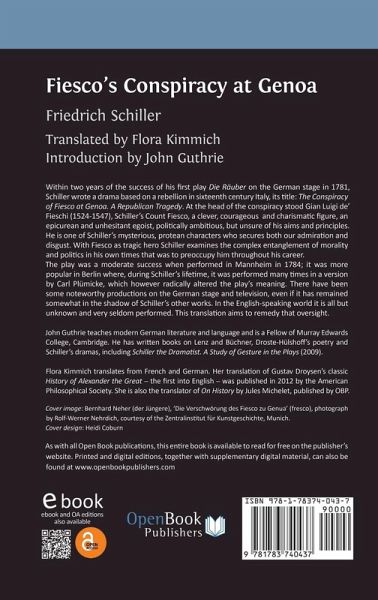 Within two years of the success of his first play Die Räuber on the German stage in 1781, Schiller wrote a drama based on a rebellion in sixteenth century Italy, its title: The Conspiracy of Fiesco at Genoa. A Republican Tragedy. At the head of the conspiracy stood Gian Luigi de' Fieschi (1524-1547), Schiller's Count Fiesco, a clever, courageous and charismatic figure, an epicurean and unhesitant egoist, politically ambitious, but unsure of his aims and principles. He is one of Schiller's mysterious, protean characters who secures both our admiration and disgust. With Fiesco as tragic hero Schiller examines the complex entanglement of morality and politics in his own times that was to preoccupy him throughout his career. The play was a moderate success when performed in Mannheim in 1784; it was more popular in Berlin, where during Schiller's lifetime, it was performed many times in a version by Carl Plümicke, which however radically altered the play's meaning. There have been some noteworthy productions on the German stage and television, even if it has remained somewhat in the shadow of Schiller' other works. In the English-speaking world it is all but unknown and very seldom performed. This translation aims to remedy that oversight.