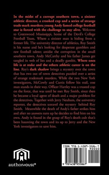In the midst of a corrupt southern town, a sinister athletic director, a crooked cop and a series of strange trade mark murders; young Andy McCarthy, famed college football star is forced with the challenge to stay alive. Welcome to Greenwood Mississippi, home of the Devil's College Football Team. Where a sinister man is hiding from a former life. The university director of athletics, Roy Smith is his name and he's looking for desperate gamblers and raw football talent. Amid the corruption in the small southern town, Andy McCarthy and his father James get tangled in web of lies and a deadly gambit. Where ones life is at stake and the others athletic career is on the line. Roy's dark shadow brings a mystery over the town that has the Greenwood county police puzzled over a series of the strange trademark murders. With help of two hired detectives from New York, McCowly and Curtis follow the county follows the trail but one man stands in their way. Officer Hartley was a trusted cop on the force, that was until he met Roy Smith, since then he became a loyal agent of death and a major problem for the detectives. Together with Jerry Neubam, the university reporter and the detectives unravel the mystery behind Roy Smith. Meanwhile the death of Andy's father strikes him and after no answers turn up he decides to find him on his own. Andy is found in the grasp of Roy's death cult that's been haunting the town and it's up to Jerry and the New York investigators to save him.