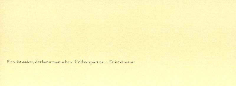 Wenn man ein Schaf zwischen Schafen ist, bei denen man sich geborgen fühlt, dann ist alles gut. Bei Fiete jedoch ist es anders, weil er anders ist. Tief in seinem Herzen spürt er, dass es irgendwo einen Ort geben muss, wo anders richtig ist. Von dieser Sehnsucht getrieben, macht er sich auf die Suche. Doch nie fühlt er sich heimisch und ihm wird immer schwerer ums Herz. Erschöpft und mutlos klettert er schließlich in einen Zug, kuschelt sich in eine Kiste, um wenigstens etwas Trost und Wärme zu finden, und schläft ein. Als er aufwacht, traut er seinen Ohren und Augen kaum: Da ist ein Rauschen, das ihm ein Wonnegefühl über den Rücken rieseln lässt, und da steht etwasGroßes, das genauso anders ist wie er - Endlich hat Fiete seinen Platz gefunden!