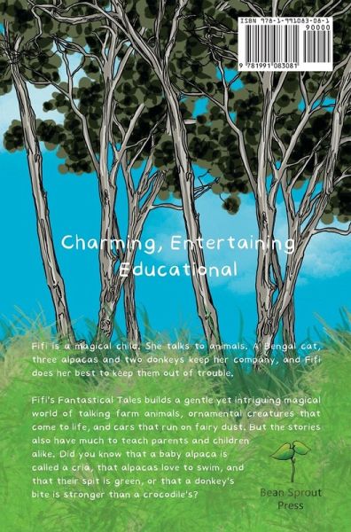 Charming, Entertaining Educational Fifi is a magical child. She talks to animals. A Bengal cat, three alpacas and two donkeys keep her company, and Fifi does her best to keep them out of trouble. Fifi's Fantastical Tales builds a gentle yet intriguing magical world of talking farm animals, ornamental creatures that come come to life, and cars that run on fairy dust. But the stories also have much to teach parents and children alike. Did you know that a baby alpaca is called a cria, that alpacas love to swim, and that their spit is green, or that a donkey's bite is stronger than a crocodile's?