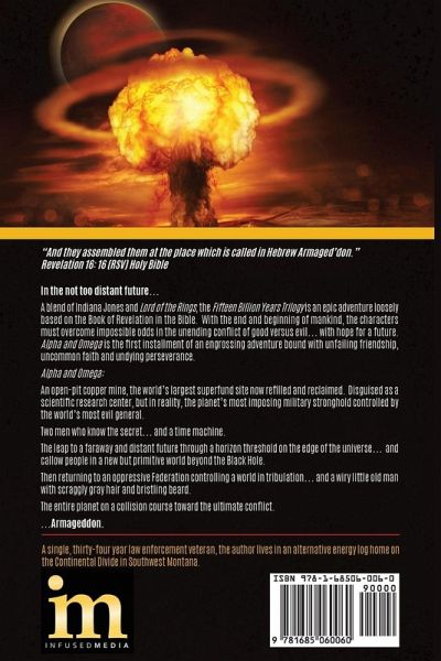 "And they assembled them at the place which is called in Hebrew Armaged'don." Revelation 16: 16 (RSV) Holy Bible In the not too distant future... A blend of Indiana Jones and Lord of the Rings, the Fifteen Billion Years Trilogy is an epic adventure loosely based on the Book of Revelation in the Bible. With the end and beginning of mankind, the characters must overcome impossible odds in the unending conflict of good versus evil... with hope for a future. Alpha and Omega is the first installment of an engrossing adventure bound with unfailing friendship, uncommon faith and undying perseverance. Alpha and Omega: An open-pit copper mine, the world's largest superfund site now refilled and reclaimed. Disguised as a scientific research center, but in reality, the planet's most imposing military stronghold controlled by the world's most evil general. Two men who know the secret... and a time machine. The leap to a faraway and distant future through a horizon threshold on the edge of the universe... and callow people in a new but primitive world beyond the Black Hole. Then returning to an oppressive Federation controlling a world in tribulation... and a wiry little old man with scraggly gray hair and bristling beard. The entire planet on a collision course toward the ultimate conflict. ...Armageddon.