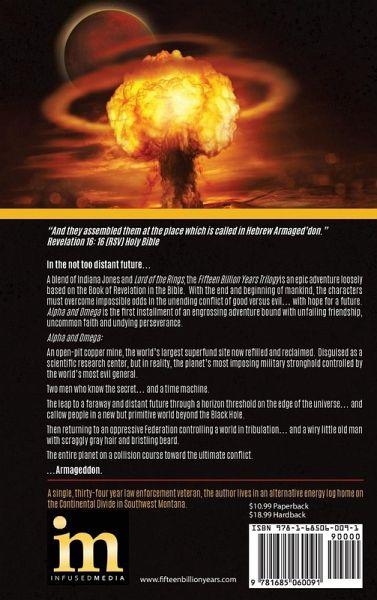 "And they assembled them at the place which is called in Hebrew Armaged'don." Revelation 16: 16 (RSV) Holy Bible In the not too distant future... A blend of Indiana Jones and Lord of the Rings, the Fifteen Billion Years Trilogy is an epic adventure loosely based on the Book of Revelation in the Bible. With the end and beginning of mankind, the characters must overcome impossible odds in the unending conflict of good versus evil... with hope for a future. Alpha and Omega is the first installment of an engrossing adventure bound with unfailing friendship, uncommon faith and undying perseverance. Alpha and Omega: An open-pit copper mine, the world's largest superfund site now refilled and reclaimed. Disguised as a scientific research center, but in reality, the planet's most imposing military stronghold controlled by the world's most evil general. Two men who know the secret... and a time machine. The leap to a faraway and distant future through a horizon threshold on the edge of the universe... and callow people in a new but primitive world beyond the Black Hole. Then returning to an oppressive Federation controlling a world in tribulation... and a wiry little old man with scraggly gray hair and bristling beard. The entire planet on a collision course toward the ultimate conflict. ...Armageddon.