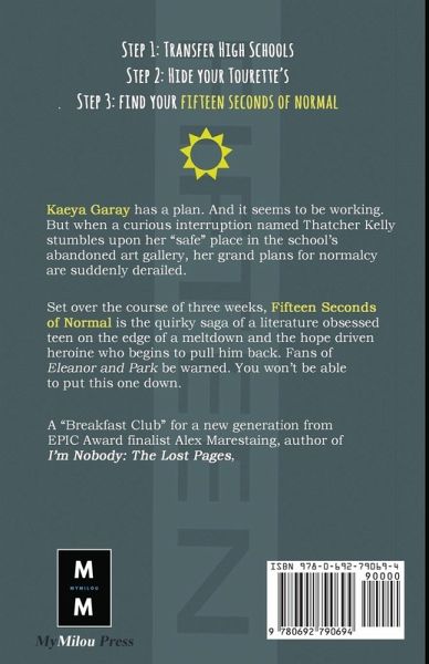 Step 1: Transfer high schools. Step 2: Hide your Tourette's. Step 3: Find your Fifteen Seconds of Normal. Kaeya Garay has a plan. And it seems to be working.But when a curious interruption named Thatcher Kelly stumbles upon her "safe" place in the school's abandoned art gallery, her grand plans for normalcy are suddenly derailed. Set over the course of three weeks, Fifteen Seconds of Normal is the quirky saga of a literature obsessed teen on the edge of a meltdown and the hope driven heroine who begins to pull him back. Fans of Eleanor and Park be warned. You won't be able to put this one down. A "Breakfast Club" for a new generation from EPIC Award finalist Alex Marestaing, author of I'm Nobody: The Lost Pages.