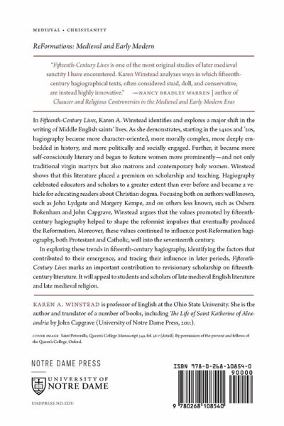In Fifteenth-Century Lives, Karen A. Winstead identifies and explores a major shift in the writing of Middle English saints' lives. As she demonstrates, starting in the 1410s and '20s, hagiography became more character-oriented, more morally complex, more deeply embedded in history, and more politically and socially engaged. Further, it became more self-consciously literary and began to feature women more prominently-and not only traditional virgin martyrs but also matrons and contemporary holy women. Winstead shows that this literature placed a premium on scholarship and teaching. Hagiography celebrated educators and scholars to a greater extent than ever before and became a vehicle for educating readers about Christian dogma. Focusing both on authors well known, such as John Lydgate and Margery Kempe, and on others less known, such as Osbern Bokenham and John Capgrave, Winstead argues that the values promoted by fifteenth-century hagiography helped to shape the reformist impulses that eventually produced the Reformation. Moreover, these values continued to influence post-Reformation hagiography, both Protestant and Catholic, well into the seventeenth century. In exploring these trends in fifteenth-century hagiography, identifying the factors that contributed to their emergence, and tracing their influence in later periods, Fifteenth-Century Lives marks an important contribution to revisionary scholarship on fifteenth-century literature. It will appeal to students and scholars of late medieval English literature and late medieval religion.