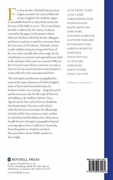 For four decades, Michael Hicks has been a figure central to the study of fifteenth-century England. His scholarly output is remarkable both for its sheer bulk and for the diversity of the fields it covers. This extraordinary breadth is reflected by the variety of subjects covered by the papers in the present volume, offered to Professor Hicks by friends, colleagues and former students to mark his retirement from the University of Winchester. Fifteenth-century royalty, nobility and gentry, long at the heart of his own work, naturally take centre stage, but his contribution to economic and regional history, both in the early part of his career as a research fellow at the Victoria County History and more recently as director of a succession of major research projects, is also reflected in the essays presented here. The individual contributions are populated by some of the major characters of Yorkist England, many of them made household names by Professor Hicks's own writings - King Edward IV and his mistresses; the Neville earls of Warwick and Salisbury; the Stafford, Herbert, Percy, Tiptoft and de Vere earls of Devon, Pembroke, Northumberland, Worcester and Oxford - while the themes covered span the full panoply of medieval life: from treason to trade, warfare to widowhood and lordship to law enforcement. Equally broad is the papers' geographical spread, covering regions from Catalonia to Normandy, from Hampshire to Yorkshire and from Worcestershire and the Welsh marches to East Anglia. Contributors: Anne Curry, Christopher Dyer, Peter Fleming, Ralph Griffiths, John Hare, Winifred Harwood, Matthew Holford, Hannes Kleineke, Gordon McKelvie, Mark Page, Simon Payling, A.J. Pollard, James Ross, Karen Stober, Anne F. Sutton