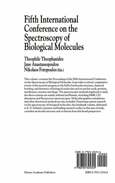 The series of Conferences on the Spectroscopy of Biological Molecules aims to stimulate research and development in this area of Science. The relationship between the structure and the biological activity of such materials as proteins, lipids, and nucleic acids is fundamental. The 5th European Conference on the Spectroscopy of Biological Molecules (ECSBM) is held at the Hotel Poseidon Club, Loutraki, Greece, on 5-10 September 1993. The scientific contents are remained the same as in the past conferences. Emphasis is given to vibrational spectroscopy, mainly infrared and Raman applied to the study of structure and dynamics of proteins, nucleic acids, porphyrins, carbohydrates, membranes, etc. Most of the contributions describe molecular dynamics and excitation processes, in particular the electronic-vibrational excitations, which are studied by Fr-Raman, Fourier Transform Infrared (Fr-IR) coupled often with microscopy and chromatography. Contributions also include Fr-Raman and FT-IR instrumentation and new developments in this area, and applications in Biology and Medicine. Furthermore, there is a plenary lecture in Mass Spectrometry and its applications in biomedical analysis, and a session devoted to Nuclear Magnetic Resonance (NMR) and its application in the study of biological molecules. Several contributions are devoted to other methods, such as CD, optical absorption, fluorescence and molecular graphics simulations. This volume of ECSBM contains shon articles by the invited and contributed lectures as well as from the Poster presentations from many European and non-European countries.