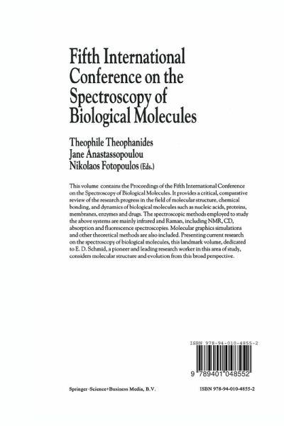 The series of Conferences on the Spectroscopy of Biological Molecules aims to stimulate research and development in this area of Science. The relationship between the structure and the biological activity of such materials as proteins, lipids, and nucleic acids is fundamental. The 5th European Conference on the Spectroscopy of Biological Molecules (ECSBM) is held at the Hotel Poseidon Club, Loutraki, Greece, on 5-10 September 1993. The scientific contents are remained the same as in the past conferences. Emphasis is given to vibrational spectroscopy, mainly infrared and Raman applied to the study of structure and dynamics of proteins, nucleic acids, porphyrins, carbohydrates, membranes, etc. Most of the contributions describe molecular dynamics and excitation processes, in particular the electronic-vibrational excitations, which are studied by Fr-Raman, Fourier Transform Infrared (Fr-IR) coupled often with microscopy and chromatography. Contributions also include Fr-Raman and FT-IR instrumentation and new developments in this area, and applications in Biology and Medicine. Furthermore, there is a plenary lecture in Mass Spectrometry and its applications in biomedical analysis, and a session devoted to Nuclear Magnetic Resonance (NMR) and its application in the study of biological molecules. Several contributions are devoted to other methods, such as CD, optical absorption, fluorescence and molecular graphics simulations. This volume of ECSBM contains shon articles by the invited and contributed lectures as well as from the Poster presentations from many European and non-European countries.