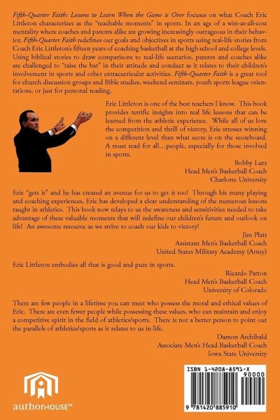 Fifth-Quarter Faith: Lessons to Learn When the Game is Over focuses on what Coach Eric Littleton characterizes as the "teachable moments" in sports. In an age of a win-at-all-cost mentality where coaches and parents alike are growing increasingly outrageous in their behavior, Fifth-Quarter Faith redefines our goals and objectives in sports using real-life stories from Coach Eric Littleton's fifteen years of coaching basketball at the high school and college levels. Using biblical stories to draw comparisons to real-life scenarios, parents and coaches alike are challenged to "raise the bar" in their attitude and conduct as it relates to their children's involvement in sports and other extracurricular activities. Fifth-Quarter Faith is a great tool for church discussion groups and Bible studies, weekend seminars, youth sports league orientations, or just for personal reading.