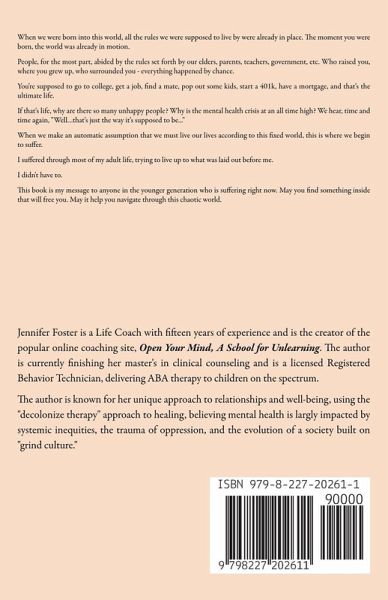 When we were born into this world, all the rules we were supposed to live by were already in place. The moment you were born, the world was already in motion. People, for the most part, abided by the rules set forth by our elders, parents, teachers, government, etc. Who raised you, where you grew up, who surrounded you - everything happened by chance. You're supposed to go to college, get a job, find a mate, pop out some kids, start a 401k, have a mortgage, and that's the ultimate life. If that's life, why are there so many unhappy people? Why is the mental health crisis at an all time high? We hear, time and time again, "Well...that's just the way it's supposed to be..." When we make an automatic assumption that we must live our lives according to this fixed world, this is where we begin to suffer. I suffered through most of my adult life, trying to live up to what was laid out before me. I didn't have to. This book is my message to anyone in the younger generation who is suffering right now. May you find something inside that will free you. May it help you navigate through this chaotic world.