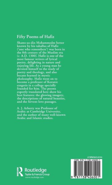 Hafiz was one of the most famous writers of lyrical poetry. The poems translated here aim to show his best features: the glowing imagery, the descriptions of natural beauties, and the fervent love passages.