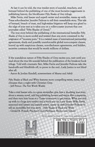 At last it can be told, the true insider story of scandal, treachery, and betrayal behind the publishing of one of the most lucrative juggernauts in publishing history, the blockbuster Fifty Shades of Grey trilogy. You've seen the stories in the news. You've read about it in blogs and chat rooms. Now, read the truth as it played out in a Texas courtroom. As Mike Farris, a seasoned trial attorney known for his grit, determination, and integrity, explained to the twelve jurors who would decide the case: "I say there's…two kinds of people. There are the naïve and the trusting; and there are the scheming and the manipulative. And when you get them together, this is what happens." The true story behind the publishing of the international bestseller Fifty Shades of Grey is more sordid and twisted than any story contained in the originator of "mommy porn." It is a maze of international partnership agreements, shady and possibly unenforceable global non-competes bound up with suspicious, constrictive service agreements, confidentiality clauses, non-disclosure agreements, and hidden, secretive contracts that would be worth millions of dollars. Four women partnered together to publish one of the most successful book series of all time, but one of the partners, Australian Amanda Hayward, absconded with the profits. Left holding the empty bag was bubbly Texas school teacher Jennifer Pedroza. Amanda's acts shattered Jennifer's dream of a bright, well-off future. When the puzzle pieces all came back together, an entirely new image had been created: one that cut Jennifer entirely out of the picture. A flurry of cease-and-desist letters, threats of criminal charges and prison, and underhanded scare tactics not only lead Jennifer to discover her own strength and courage, but to discover the attorney willing to stand beside her and fight for justice. Mike Farris, trial lawyer and superb writer and storyteller, teams up with Jennifer Pedroza to tell their remarkable story. This tale of betrayal, breach of trust, and high-stakes litigation will keep you glued to the edge of your seat as it takes you on a roller-coaster journey that one journalist called "Fifty Shades of Greed."