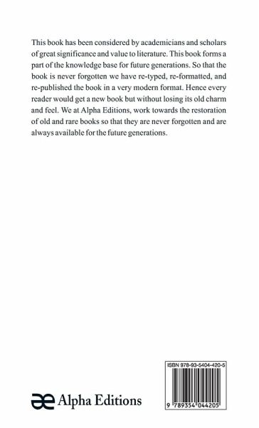 This book has been considered by academicians and scholars of great significance and value to literature. This book forms a part of the knowledge base for future generations. So that the book is never forgotten we have re-typed, re-formatted, and re-published the book in a very modern format. Hence every reader would get a new book but without losing its old charm and feel. We at Alpha Editions, work towards the restoration of old and rare books so that they are never forgotten and are always available for the future generations.