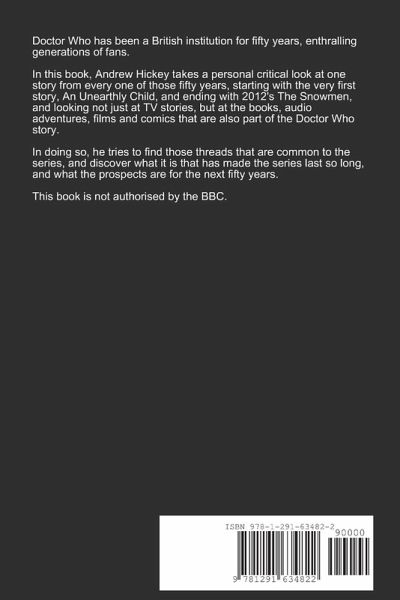 Doctor Who has been a British institution for fifty years, enthralling generations of fans. In this book, Andrew Hickey takes a personal critical look at one story from every one of those fifty years, starting with the very first story, An Unearthly Child, and ending with 2012's The Snowmen, and looking not just at TV stories, but at the books, audio adventures, films and comics that are also part of the Doctor Who story. In doing so, he tries to find those threads that are common to the series, and discover what it is that has made the series last so long, and what the prospects are for the next fifty years. This book is not authorised by the BBC.