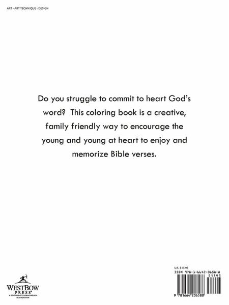 Do you struggle to commit to heart God's word? This coloring book is a creative, family friendly way to encourage the young and young at heart to enjoy and memorize Bible verses.