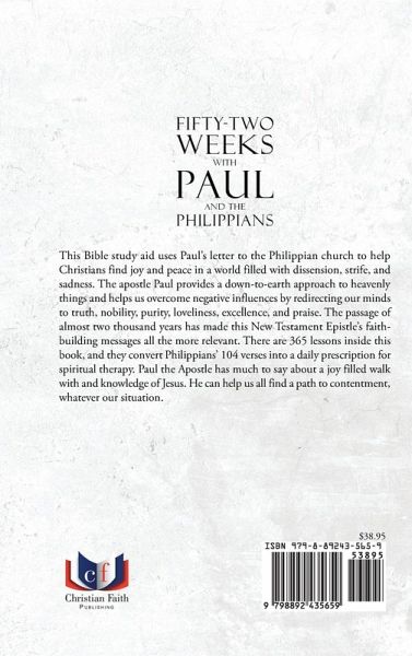 This Bible study aid uses Paul's letter to the Philippian church to help Christians find joy and peace in a world filled with dissension, strife, and sadness. The apostle Paul provides a down-to-earth approach to heavenly things and helps us overcome negative influences by redirecting our minds to truth, nobility, purity, loveliness, excellence, and praise. The passage of almost two thousand years has made this New Testament Epistle's faith-building messages all the more relevant. There are 365 lessons inside this book, and they convert Philippians' 104 verses into a daily prescription for spiritual therapy. Paul the Apostle has much to say about a joy filled walk with and knowledge of Jesus. He can help us all find a path to contentment, whatever our situation.