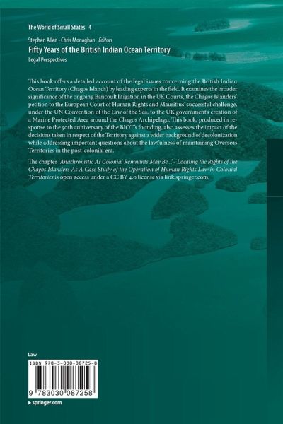 This book offers a detailed account of the legal issues concerning the British Indian Ocean Territory (Chagos Islands) by leading experts in the field. It examines the broader significance of the ongoing Bancoult litigation in the UK Courts, the Chagos Islanders' petition to the European Court of Human Rights and Mauritius' successful challenge, under the UN Convention of the Law of the Sea, to the UK government's creation of a Marine Protected Area around the Chagos Archipelago. This book, produced in response to the 50th anniversary of the BIOT's founding, also assesses the impact of the decisions taken in respect of the Territory against a wider background of decolonization while addressing important questions about the lawfulness of maintaining Overseas Territories in the post-colonial era.The chapter 'Anachronistic As Colonial Remnants May Be...' - Locating the Rights of the Chagos Islanders As A Case Study of the Operation of Human Rights Law in Colonial Territories is openaccess under a CC BY 4.0 license via link.springer.com.