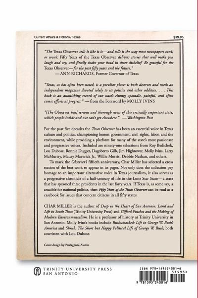 While "The Texas Observer" has ventured beyond Texas in its editorial coverage, Miller has chosen a half-century of essays that specifically speak to the state's politics, people, environment, culture, and locales.