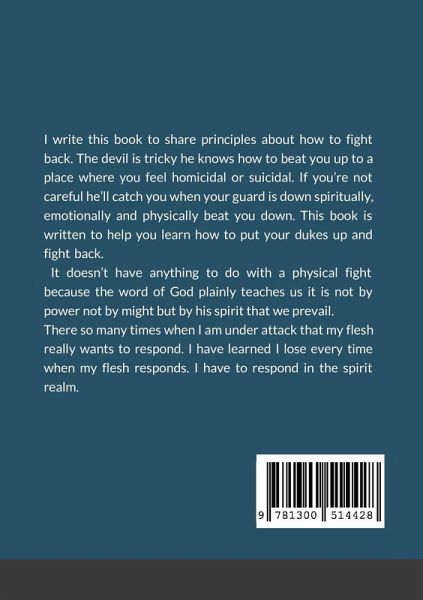 I write this book to share principles about how to fight back. The devil is tricky he knows how to beat you up to a place where you feel homicidal or suicidal. If you're not careful he'll catch you when your guard is down spiritually, emotionally and physically beat you down. This book is written to help you learn how to put your dukes up and fight back. It doesn't have anything to do with a physical fight because the word of God plainly teaches us it is not by power not by might but by his spirit that we prevail. There so many times when I am under attack that my flesh really wants to respond. I have learned I lose every time when my flesh responds. I have to respond in the spirit realm.