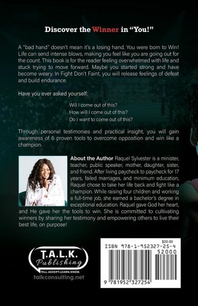 Discover the winner inside of you. A "bad hand" doesn't mean it's a losing hand. You were born to Win! Life can send intense blows, making you feel like you are going out for the count. This book is for the reader feeling overwhelmed with life and stuck trying to move forward. Maybe you started strong and have become weary. In Fight Don't Faint, you will release feelings of defeat and build endurance. Have you ever asked yourself: Will I come out of this? How will I come out of this? Do I want to come out of this? Through personal testimonies and practical insight, you will gain awareness of 6 proven tools to overcome opposition and win like a champion. Put Your Dukes Up; It's Time To Fight!