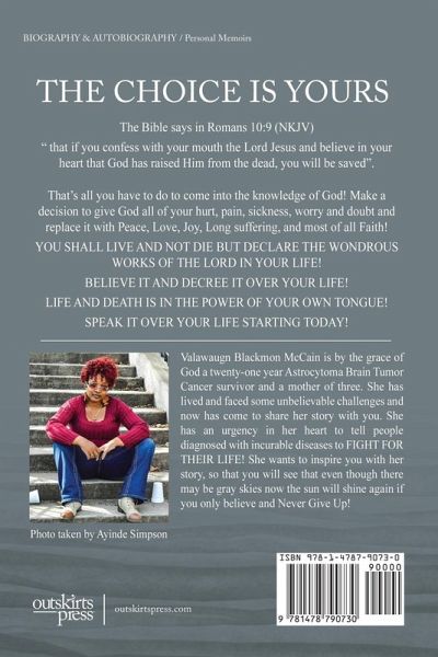FIGHT FOR YOUR LIFE: The Journey, is a book about the life of Valawaugn Blackmon diagnosed with an Astrocytoma Grade 3 Brain Tumor. It is a book that is written to encourage all who are sick and fighting for their life, to FIGHT as I have done and NEVER GIVE UP! "Your death sentence is not your demise!" Have faith and believe in the one who created you! "I am a living witness that Jesus is a healer". Yes, some go home to be with our father but most die before their time because they give up. I know you are asking God why, I know your angry and seem defeated but there is hope! You're not alone! The cancer road is not an easy one! It is dark and it is lonely, not only for the one with the playing cards only, but also for the ones that are in the game with you, around the table, the care giver. This is a book not written by a world renowned author but a simple ole country girl from high-smith side, a little area in Roseboro, NC. A woman that loves God and people. It is written from the voice and personality of Valawaugn herself who created it. This book was prophesied that she would write it and it has come to pass by the inspiration of almighty God. This is my life! Will all of you come take this journey with me? Let's all jump in the driver seat with all our cares, pains, disappointments and woes. You don't have to carry them by yourself! I am with you, now let's drive! Let's FIGHT! FIGHT FOR OUR LIFE!