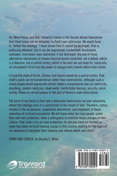 He, Mme Pelosy, and their defeatist friends in the Senate delude themselves that Jihad Islam can be defeated, by Reid's own admission. We would have to "defeat the ideology." I have shown that it cannot be destroyed, that is, politically defeated. But it can be suppressed, condemned, invalidated, outlawed, innervated, even redirected, if not destroyed. Any one of these alternative redirections of Islamo-fascism would constitute, not a defeat, which is a delusion, but a partial victory, which is the best we can hope for, since only an omnipotent Christ has the power to change men's hearts before their minds. A tripartite state of Kurds, Shiites, and Sunnis would be a partial victory. That state's goals can be humanitarian rather than materialistic, although such a mixed people would appreciate certain modern conveniences like ice, electricity, plumbing, modern medicine, clean water, comfortable housing, security, social comity. These are all extraneous of the glut of Western-style materialism. The point of my thesis is that only a delusional destruction can ever absolutely defeat the ideology once it is constructed in the minds of men. Therefore, victory resides in the acceptance, cooperative attainment, and enjoyment of these amenities of civilized humankind. We will leave when the Iraqi people, under their own self-protection, show a willingness to institute these changes in their culture. That route is for our own protection, for already there are formed up some two dozen terrorist training camps in this country, waiting for the signs of our weakness to heighten their violence and release death and chaos. FRONT AND CENTER, by Charles E. Miller