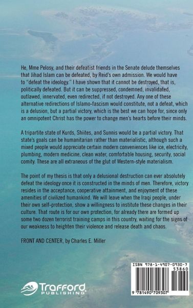He, Mme Pelosy, and their defeatist friends in the Senate delude themselves that Jihad Islam can be defeated, by Reid's own admission. We would have to "defeat the ideology." I have shown that it cannot be destroyed, that is, politically defeated. But it can be suppressed, condemned, invalidated, outlawed, innervated, even redirected, if not destroyed. Any one of these alternative redirections of Islamo-fascism would constitute, not a defeat, which is a delusion, but a partial victory, which is the best we can hope for, since only an omnipotent Christ has the power to change men's hearts before their minds. A tripartite state of Kurds, Shiites, and Sunnis would be a partial victory. That state's goals can be humanitarian rather than materialistic, although such a mixed people would appreciate certain modern conveniences like ice, electricity, plumbing, modern medicine, clean water, comfortable housing, security, social comity. These are all extraneous of the glut of Western-style materialism. The point of my thesis is that only a delusional destruction can ever absolutely defeat the ideology once it is constructed in the minds of men. Therefore, victory resides in the acceptance, cooperative attainment, and enjoyment of these amenities of civilized humankind. We will leave when the Iraqi people, under their own self-protection, show a willingness to institute these changes in their culture. That route is for our own protection, for already there are formed up some two dozen terrorist training camps in this country, waiting for the signs of our weakness to heighten their violence and release death and chaos. FRONT AND CENTER, by Charles E. Miller