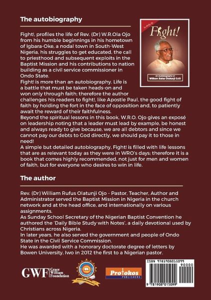 Fight!, profiles the life of Rev. (Dr) W.R.Ola Ojo from his humble beginnings in his hometown of Igbara-Oke, a nodal town in South-West Nigeria, his struggles to get educated, the call to priesthood and subsequent exploits in the Baptist Mission and his contributions to nation building as a civil service commissioner in Ondo State. Beyond the spiritual lessons in this book, W.R.O. Ojo gives an exposé on leadership noting that a leader must lead by example, be honest and always ready to give because, we are all debtors and since we cannot pay our debts to God directly, we should pay it to those in need! A simple but detailed autobiography, Fight! is filled with life lessons that are as relevant today as they were in WRO’s days; therefore it is a book that comes highly recommended, not just for men and women of faith, but for everyone who desires to win in life.