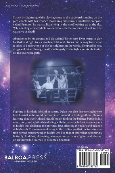 Struck by Lightning while playing alone in the backyard standing on the picnic table with his wooden sword in a rainstorm, a small boy everyone called Peanuts: he was so little lying in the mud looking up at the sky. While feeling an incredible connection with the universe yet not sure he was alive or dead? Abandoned by his parents and placed into foster care. Dyln learns to play football and fight to survive his childhood. Turns out he may have what it takes to become one of the best fighters in the world. Tempted by sex, drugs and music through death and tragedy, Dylan fights for his life to stay on the love word path. Fighting in his daily life and in sports, Dylan was also discovering how to heal himself so he could become instrumental in healing others. He was learning that true Holistic Health meant finding the balance between his mind, body, and spirit, while dealing with the extreme behaviors and events in his life that challenge the universal laws affecting the pillars and balance of his health. Dylan was awakening to the realization that the transformation he was experiencing in his life was like that of caterpillar becoming a butterfly. And that, ultimately, he was put on earth as a fighter and a healer on an incredible journey to become a Shaman!