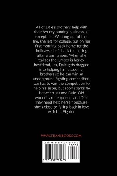 All of Dale's brothers help with their bounty hunting business, all except her. Wanting out of that life, she left for college, but on her first morning back home for the holidays, she’s back to chasing after a bail jumper. When she realizes the jumper is her ex-boyfriend, Jax, Dale gets dragged into helping him evade her brothers so he can win an underground fighting competition. Jax has to win the competition to help his sister, but soon sparks fly between Jax and Dale. Old wounds are reopened, and Dale may need help herself because she’s close to falling back in love with her Fighter. Novella*