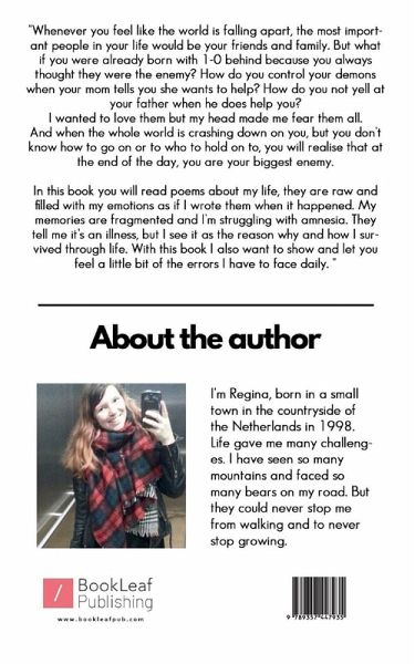 ""Whenever you feel like the world is falling apart, the most important people in your life would be your friends and family. But what if you were already born with 1-0 behind because you always thought they were the enemy? How do you control your demons when your mom tells you she wants to help? How do you not yell at your father when he does help you? I wanted to love them but my head made me fear them all. And when the whole world is crashing down on you, but you don't know how to go on or to who to hold on to, you will realise that at the end of the day, you are your biggest enemy. In this book you will read poems about my life, they are raw and filled with my emotions as if I wrote them when it happened. My memories are fragmented and I'm struggling with amnesia. They tell me it's an illness, but I see it as the reason why and how I survived through life. With this book I also want to show and let you feel a little bit of the errors I have to face daily.""