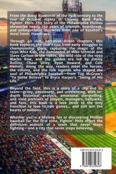 From the dusty diamonds of the 19th century to the roar of October nights at Citizens Bank Park, Fightin' Phils: The Story of the Philadelphia Phillies chronicles nearly 150 years of triumph, heartbreak, and unforgettable moments from one of baseball's most iconic franchises. Through 40 rich, narrative-driven chapters, this book explores the club's rise from early struggles to championship glory, capturing the magic of the 1950 Whiz Kids, the dominance of Mike Schmidt and Steve Carlton in the 1980s, the wild ride of the 1993 Macho Row, and the golden era led by Jimmy Rollins, Chase Utley, Ryan Howard, and Cole Hamels. Along the way, readers meet the heroes, the villains, and the folk legends who shaped the soul of Philadelphia baseball-from Tug McGraw's "Ya Gotta Believe" to Bryce Harper's "Swing of His Life." Beyond the field, this is a story of a city and its team-gritty, passionate, and unrelenting. With in-depth historical analysis, emotional storytelling, and vivid portraits of players, managers, ballparks, and fans, this book is a love letter to the only franchise to lose 10,000 games... and still win the hearts of millions. Whether you're a lifelong fan or discovering Phillies baseball for the first time, Fightin' Phils offers the definitive account of a team that never stops fighting-and a city that never stops believing.