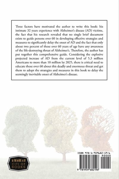 Three factors have motivated the author to write this book: his intimate 32 years of experience with Alzheimer's disease (AD) victims, the fact that his research revealed that no single brief document exists to guide persons over 60 in developing effective strategies and measures to significantly delay the onset of AD and the fact that only about two percent of those over 60 years of age have any awareness of the life-destroying threat of Alzheimer's. Therefore, the author has put together this comprehensive guide. Considering the explosive projected increase of AD from the current level of 5.3 million Americans to more than 10 million by 2025, there is a critical need to educate those over 60 about this deadly and enormous threat and get them to adopt the strategies and measures in this book to delay the seemingly inevitable onset of Alzheimer's disease.