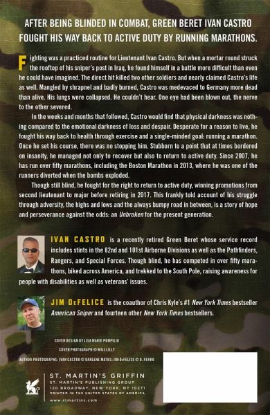Fighting was a practiced routine for Lieutenant Ivan Castro. But when a mortar round struck the rooftop of his sniper's post in Iraq, he found himself in a battle more difficult than even he could have imagined. The direct hit killed two other soldiers and nearly claimed Castro's life as well. Mangled by shrapnel and badly burned, Castro was medevac'd to Germany more dead than alive. His lungs were collapsed. He couldn't hear. One eye had been blown out, the nerve to the other severed. In the weeks and months that followed, Castro would find that physical darkness was nothing compared to the emotional darkness of loss and despair. Desperate for a reason to live, he eventually fought his way back to health through exercise and a single-minded goal: running a marathon. Once he set his course, there was no stopping him. Stubborn to a point that at times bordered on insanity, he managed not only to recover but to return to active duty. Since 2007, he has run over two dozen marathons, including the Boston Marathon in 2013, where he was one of the runners diverted when the bombs exploded. Today, Castro helps prepare soldiers for combat, working exactly as if he were "sighted." Fighting Blind, this frankly told account of his struggle through adversity, the highs and lows and the always bumpy road in between, is a story of hope and perseverance against the odds: an Unbroken for the present generation.