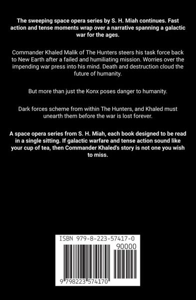 The sweeping space opera series by S. H. Miah continues. Fast action and tense moments wrap over a narrative spanning a galactic war for the ages. Commander Khaled Malik of The Hunters steers his task force back to New Earth after a failed and humiliating mission. Worries over the impending war press into his mind. Death and destruction cloud the future of humanity. But more than just the Konx poses danger to humanity. Dark forces scheme from within The Hunters, and Khaled must unearth them before the war is lost forever. A space opera series from S. H. Miah, each book designed to be read in a single sitting. If galactic warfare and tense action sound like your cup of tea, then Commander Khaled's story is not one you wish to miss.