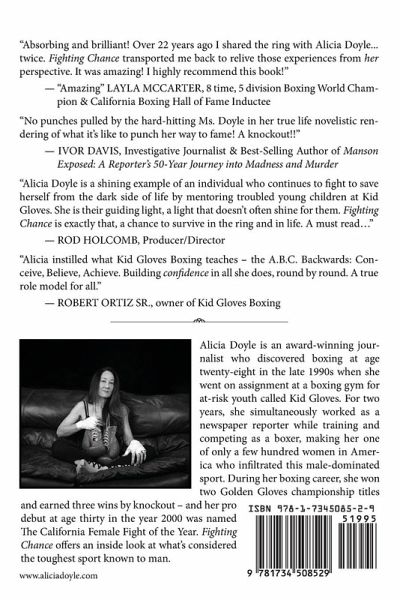 From the Midwest Book Review: A unique and unreservedly recommended addition to community and college/university library Contemporary American Women Biography collections in general, and American Boxing History supplemental studies lists in particular Fighting Chance is exceptionally well written, organized and presented. Based on a true story, Fighting Chance is written by Alicia Doyle, an award-winning journalist who discovered boxing at age twenty-eight in the late 1990s when she went on assignment at a boxing gym for at-risk youth called Kid Gloves. For two years, she simultaneously worked as a newspaper reporter while training and competing as a boxer, making her one of only a few hundred women in America who infiltrated this male-dominated sport. During her boxing career, she won two Golden Gloves championship titles and earned three wins by knockout - and her pro debut at age thirty in the year 2000 was named The California Female Fight of the Year. Fighting Chance offers an inside look at what's considered the toughest sport known to man.