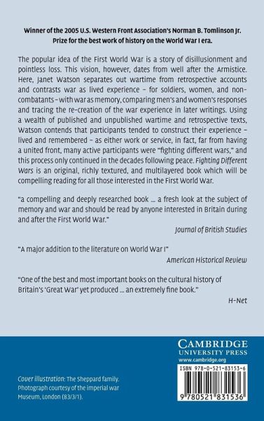 The popular idea of the First World War is a story of disillusionment and pointless loss. This vision, however, dates from well after the Armistice. In this 2004 book Janet Watson separates out wartime from retrospective accounts and contrasts war as lived experience - for soldiers, women and non-combatants - with war as memory, comparing men's and women's responses and tracing the re-creation of the war experience in later writings. Using a wealth of published and unpublished wartime and retrospective texts, Watson contends that participants tended to construct their experience - lived and remembered - as either work or service. In fact, far from having a united front, many active participants were in fact 'fighting different wars', and this process only continued in the decades following peace. Fighting Different Wars is an interesting, richly textured and multi-layered book which will be compelling reading for all those interested in the First World War.