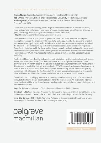 This edited collection is highly innovative in showing not only the many facets of environmental crime, but also how it should be conceptualised and the consequences. An original and rigorous study, this book will be of particular interest to policy makers and scholars of green criminology andenvironmental studies.