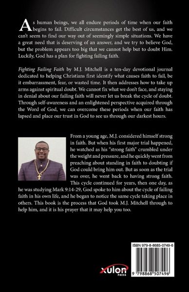 As human beings, we all endure periods of time when our faith begins to fail. Difficult circumstances get the best of us, and we can't seem to find our way out of seemingly simple situations. We have a great need that is deserving of an answer, and we try to believe God, but the problem appears too big that we cannot help but to doubt Him. Luckily, God has a plan for fighting failing faith. Fighting Failing Faith by M.J. Mitchell is a ten-day devotional journal dedicated to helping Christians first identify what causes faith to fail, be it embarrassment, fear, or wasted time. It then addresses how to take up arms against spiritual doubt. We cannot fix what we don't face, and staying in denial about our failing faith will never let us break the cycle of doubt. Through self-awareness and an enlightened perspective acquired through the Word of God, we can overcome these periods when our faith has lapsed and place our trust in God to see us through our darkest hours. From a young age, M.J. considered himself strong in faith. But when his first major trial happened, he watched as his "strong faith" crumbled under the weight and pressure, and he quickly went from preaching about standing in faith to doubting if God could bring him out. But as soon as the trial was over, he went back to having strong faith. This cycle continued for years, then one day, as he was studying Mark 9:14-29, God spoke to him about the cycle of failing faith in his own life, and he began to notice the same cycle taking place in others. This book is the process that God took M.J. Mitchell through to help him, and it is his prayer that it may help you too.