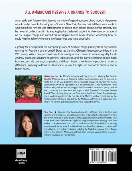 "During these dark times when increasing reports of AAPI Hate are escalating, Fighting for Change: Andrew Yang's Path Forward provides a bright light. Yang has taken the Asian-American community forward by stepping front and center in the fight against exclusion. He continues to work on ways to create a better America, striving to achieve greater equality. While this is a book for young readers, it reaches across all age groups, telling the story of one man's determination to make a difference in achieving a stronger, more diverse United States. It's a welcome addition to any library. " New York Times bestselling author Gail Tsukiyama ALL AMERICANS DESERVE A CHANCE To SUCCEED! At an early age, Andrew Yang learned the value of a good education, hard work, and perseverance from his parents. Growing up in Somers, New York, Andrew noticed there were few kids who looked like him. He was often ignored or picked on in school because of his ethnicity, but he never let bullies stand in his way. A gifted and talented student, Andrew went on to attend an Ivy League college and earned his law degree, but he never stopped wondering how he could help his fellow Americans live better lives and have good jobs. Fighting for Change tells the compelling story of Andrew Yang's journey from boyhood to running for President of the United States as the first Chinese-American candidate in the 21st century. With a deep commitment to humanity and a mission to achieve equality for all, Andrew proposed solutions to poverty, joblessness, and the barriers holding people back from success. His courage, compassion, and determination show how one person can make a difference, inspiring millions of Americans to join the fight for economic fairness and a better future.