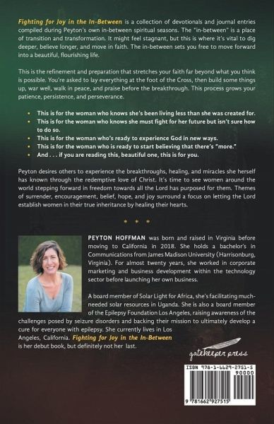 Fighting for Joy is a collection of devotionals and journal entries compiled during Peyton's own in-between spiritual seasons. The "in-between" is a place of transition and transformation. It might feel stagnant, but this is where it's vital to dig deeper, believe longer, and move in faith. The in-between sets you free to move forward into a beautiful, flourishing life. This is the refinement and preparation that stretches your faith far beyond what you think is possible. You're asked to lay everything at the foot of the Cross, then build some things up, war well, walk in peace, and praise before the breakthrough. This process grows your patience, persistence, and perseverance. This is for the woman who knows she's been living less than she was created for. This is for the woman who knows she must fight for her future but isn't sure how to do so. This is for the woman who's ready to experience God in new ways. This is for the woman who is ready to start believing that there's "more." And . . . if you are reading this, beautiful one, this is for you. Peyton desires others to experience the breakthroughs, healing, and miracles she herself has known through the redemptive love of Christ. It's time to see women around the world stepping forward in freedom towards all the Lord has purposed for them. Themes of surrender, encouragement, belief, hope, and joy surround a focus on letting the Lord establish women in their true inheritance by healing their hearts.