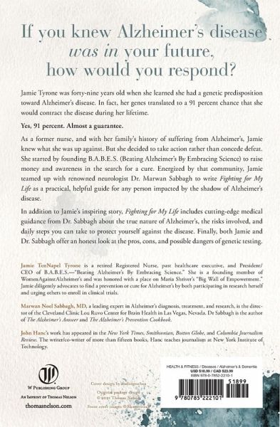 A practical, helpful guide on how to fight back against Alzheimer's disease--with expert medical advice and one woman's inspiring personal journey. Jamie Tyrone was forty-nine years old when she learned by accident through genetic testing that she had a 91% chance of getting Alzheimer's disease. She was shocked, but after an initial bout with depression she decided to take action rather than concede defeat. Jamie teamed up with Dr. Marwan Sabbagh, a renowned neurologist, and together they created a resource detailing not just Jamie's experience, but expert medical advice for anyone facing the disease. This book is a practical, helpful guide for those who know they're at greater risk of contracting Alzheimer's disease. With cutting-edge medical guidance from Dr. Sabbagh about the true nature of Alzheimer's, the risks involved, and daily steps you can take to protect yourself, Jamie's story will encourage and empower you. In Fighting for My Life, readers will: * Gain expert medical advice from Dr. Sabbagh on how to fight back against the disease * Discover the pros, cons and possible dangers of genetic testing * Witness a first-hand account of how to deal with the shadow of Alzheimer's disease through Jamie's story If Alzheimer's has affected your life or the life of someone you know, this book is for you. You'll be armed with information and ready to tackle Alzheimer's head-on.