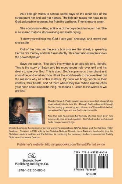 As a little girl walks to school, some boys on the other side of the street taunt her and call her names. The little girl raises her head up to God, asking him to protect her from the bad boys. Then she says amen. She continues walking until one of the boys decides to join her. She is so scared that she stops walking and starts crying. "I know you will help me, God. I love you," she says, and knows that she is safe. Out of the blue, as the scary boy crosses the street, a speeding Ferrari hits the boy and kills him instantly. This dramatic example shows the power of prayer. Says the author, "The story I've written is an age-old one, literally. This is the story of Satan and his monotonous rule over evil and his desire to rule over God. This is about God's supremacy, triumphant as it should be, and what and how I think the world needs to discover like I did the reasons why all of this matters. My book will bring people to their centers, their hearts, and hit them where they live. When God touches your heart about a specific thing, He means it. Listen to His words or we are lost." Minister Tanya E. Partin Lawton grew up in Boston, Roxbury to be exact, in the Mission Hill Projects. "My mom bought a house in Roxbury and we were there thirty years. My children grew up in that home. It still stands to this day. I advocate for the single mother and what her destiny could be, breaking the single mother cycle." She is currently writing her third book. Publisher's website: http://sbprabooks.com/TanyaEPartinLawton