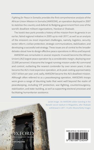 Fighting for Peace in Somalia provides the first comprehensive analysis of the African Union Mission in Somalia (AMISOM), an operation deployed in 2007 to stabilize the country and defend its fledgling government from one of the world's deadliest militant organizations, Harakat al-Shabaab. The book's two parts provide a history of the mission from its genesis in an earlier, failed regional initiative in 2005 up to mid-2017, as well as an analysis of the mission's six most important challenges, namely, logistics, security sector reform, civilian protection, strategic communications, stabilization, and developing a successful exit strategy. These issues are all central to the broader debates about how to design effective peace operations in Africa and beyond. AMISOM was remarkable in several respects: it would become the African Union's (AU) largest peace operation by a considerable margin deploying over 22,000 soldiers; it became the longest running mission under AU command and control, outlasting the nearest contender by over seven years; it also became the AU's most expensive operation, at its peak costing approximately US$1 billion per year; and, sadly, AMISOM became the AU's deadliest mission. Although often referred to as a peacekeeping operation, AMISOM's troops were given a range of daunting tasks that went well beyond the realm of peacekeeping, including VIP protection, war-fighting, counterinsurgency, stabilization, and state-building as well as supporting electoral processes and facilitating humanitarian assistance.