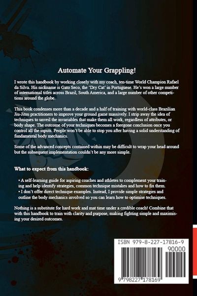 Automate Your Grappling! I wrote this handbook by working closely with my coach, ten-time World Champion Rafael da Silva. His nickname is Gato Seco, the 'Dry Cat' in Portuguese. He's won a large number of international titles across Brazil, South America, and a large number of other competitions around the globe. This book condenses more than a decade and a half of training with world-class Brazilian Jiu-Jitsu practitioners to improve your ground game massively. I strip away the idea of techniques to unveil the invariables that make them all work, regardless of attributes, or body shape. The outcome of your techniques becomes a foregone conclusion once you control all the inputs. People won't be able to stop you after having a solid understanding of fundamental body mechanics. Some of the advanced concepts contained within may be difficult to wrap your head around but the subsequent implementation couldn't be any more simple. What to expect from this handbook: ¿ A self-learning guide for aspiring coaches and athletes to complement your training and help identify strategies, common technique mistakes and how to fix them. ¿ I don't offer direct technique examples. Instead, I provide simple strategies and outline the body mechanics involved so you can learn how to optimise techniques. Nothing is a substitute for hard work and mat time under a credible coach! Combine that with this handbook to train with clarity and purpose, making fighting simple and maximising your desired outcomes.
