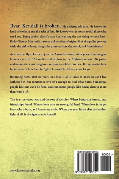 Ryan Kendall is broken. He understands pain. He knows the hand of violence and the ache of loss. He knows what it means to fail those who need you. Being broken doesn't stop him wanting the one thing he can't have; Finlay Tanner. Her smile is sweet and her future bright. She's the girl he grew up with, the girl he loves, the girl he protects from the world, and from himself. At nineteen, Ryan leaves to join the Australian Army. After years of training he becomes an elite SAS soldier and deploys to the Afghanistan war. His patrol undertakes the most dangerous missions a soldier can face. But no matter how far he runs, or how hard he fights, his need for Finlay won't let go. Returning home after six years, one look is all it takes to know he can't live without her. But sometimes love isn't enough to heal what hurts. Sometimes people like him can't be fixed, and sometimes people like Finlay deserve more than what's left. This is a story about war and the cost of sacrifice. Where bonds are formed, and friendships found. Where those who are strong, fall hard. Where love is let go, heartache is born, and heroes are made. Where one man learns that the hardest fight of all, is the fight to save himself. This book is recommended for 18+ due to adult language and themes. Please note: K McCarthy is an Australian author and Australian spelling, language and slang has been used in this book.