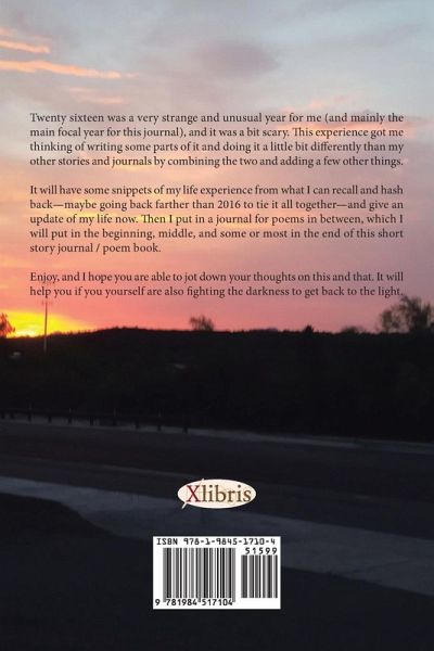 Twenty sixteen was a very strange and unusual year for me (and mainly the main focal year for this journal), and it was a bit scary. This experience got me thinking of writing some parts of it and doing it a little bit differently than my other stories and journals by combining the two and adding a few other things. It will have some snippets of my life experience from what I can recall and hash backmaybe going back farther than 2016 to tie it all togetherand give an update of my life now. Then I put in a journal for poems in between, which I will put in the beginning, middle, and some or most in the end of this short story journal / poem book. Enjoy, and I hope you are able to jot down your thoughts on this and that. It will help you if you yourself are also fighting the darkness to get back to the light.